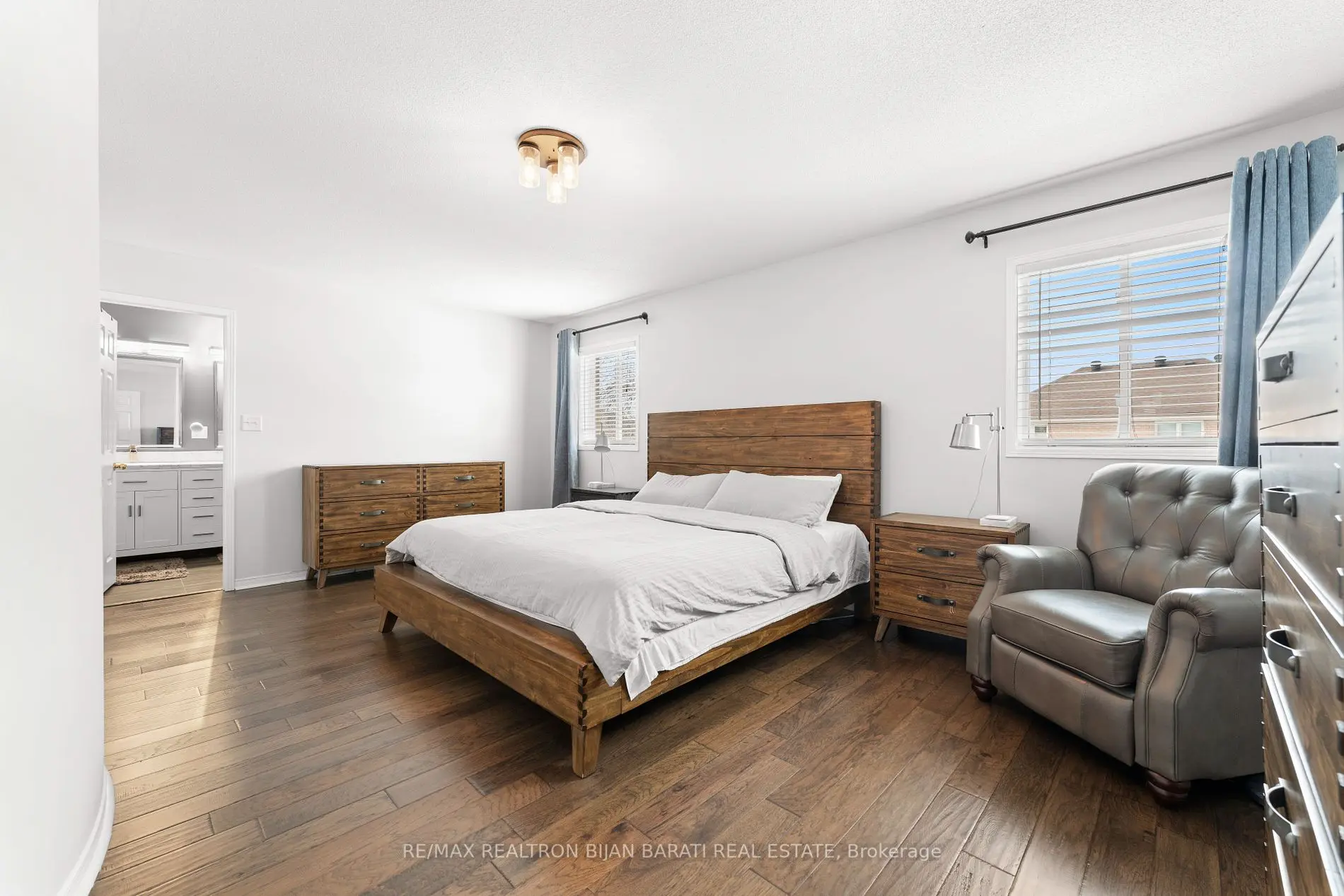This beautifully appointed primary bedroom blends warm hardwood flooring, classic wood furnishings, and an abundance of natural light to create a serene and sophisticated retreat.